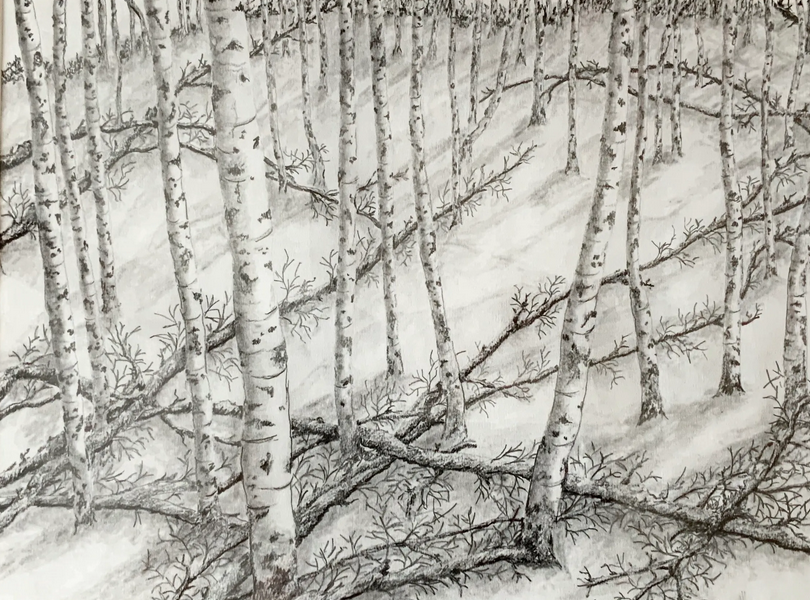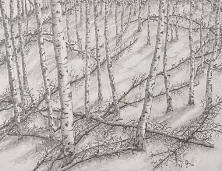 Size – 23″ wide x 19″ tall, Pencil drawing, brown wood frame, matted with glass cover (will work with client of other framing options).